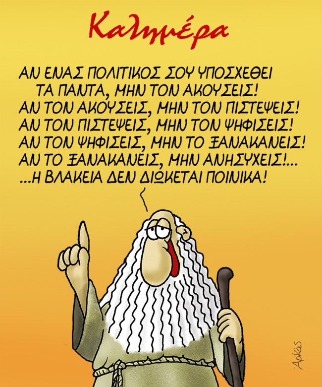 Ο σοφός Προφήτης λέει προς τον λαό: "Αν ένας πολιτικός σου υποσχεθεί τα πάντα, μην τον ακούσεις. Αν τον ακούσεις, μην τον πιστέψεις. Αν τον πιστέψεις, μην τον ψηφίσεις. Αν τον ψηφίσεις, μην το ξανακάνεις. Αν το ξανακάνεις, μην ανησυχείς... η βλακεία δεν διώκεται ποινικά!".
